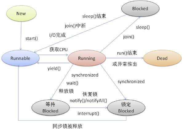 线程在运行状态过程中,可能有多个原因导致当前线程不继续运行下去,比如用户主动让线程睡眠(睡眠一定的时间之后再重新执行)、用户主动让线程等待,或者被同步块给阻塞,此时就对应着多个状态:time waiting(睡眠或等待一定的事件)、waiting(等待被唤醒)、blocked(阻塞)。